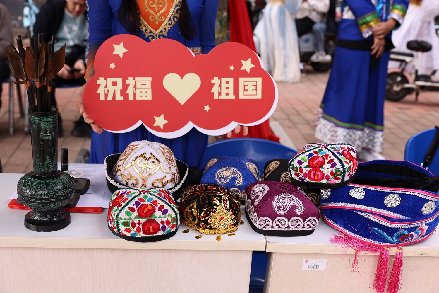 民族文化展覽體驗(yàn)區(qū),同學(xué)們體驗(yàn)形式多樣的民族特色活動(dòng)。展品區(qū),同學(xué)們試戴精美的民族特色帽子拍照打卡留念。文化區(qū),體驗(yàn)毛筆書法,藏文書法和剪紙,感受悠久燦爛的中華民族文化。游戲區(qū),同學(xué)們在體驗(yàn)中學(xué)習(xí),在交流中交融,編織了北工商一幅幅手足相親的民族團(tuán)結(jié)畫卷。