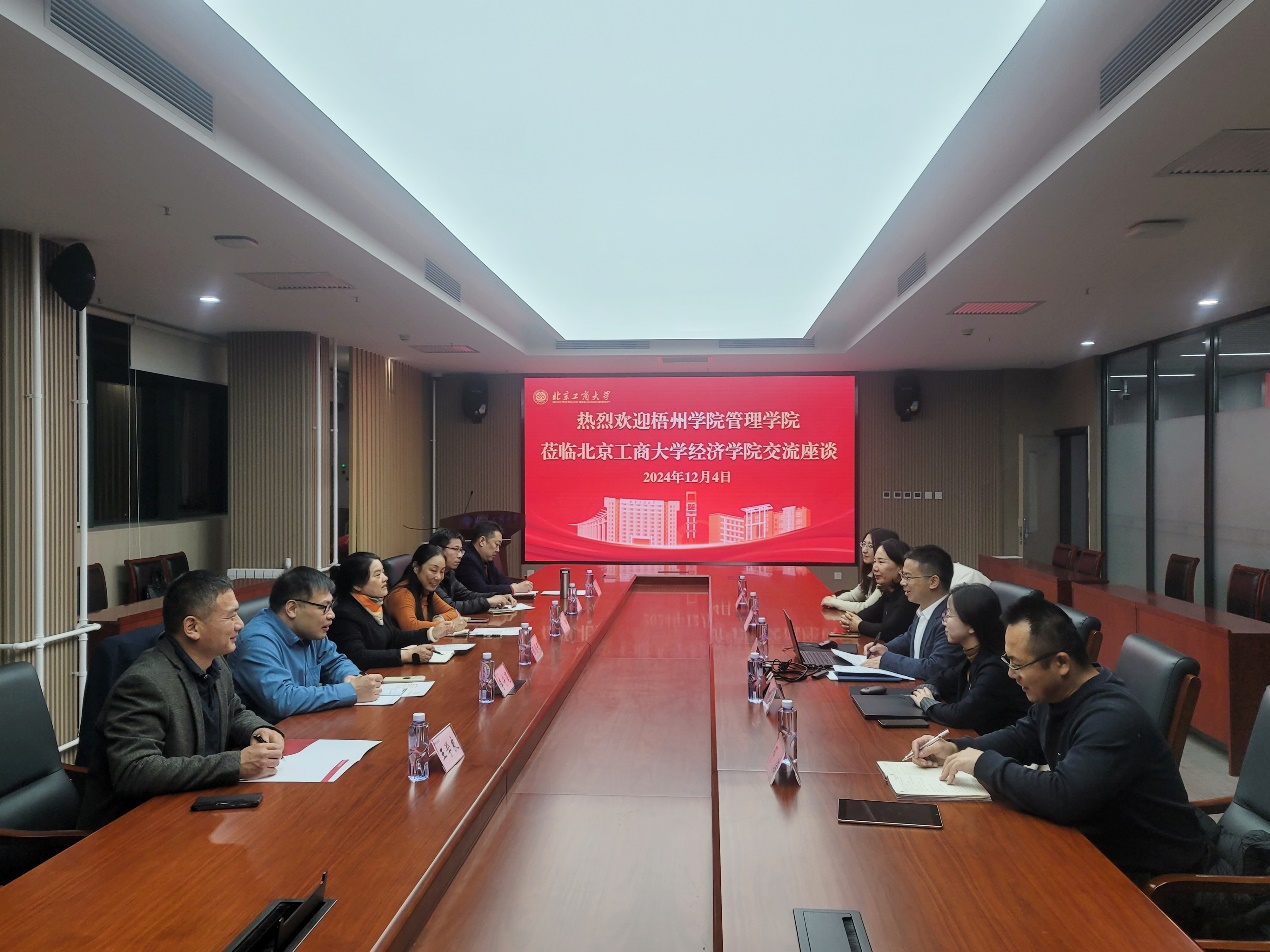 12月4日晚,梧州學院管理學院張堂云院長帶領副院長趙虹、工商管理教研室主任李守亳、樂小兵教授、王學良副教授、姜河博士一行六人來經濟學院進行調研交流。經濟學院執行院長詹新宇、副院長牛曉燕、院長助理崔怡、經濟系主任陳真玲以及辦公室主任鄧浩參加此次交流會議。會議由詹新宇主持。