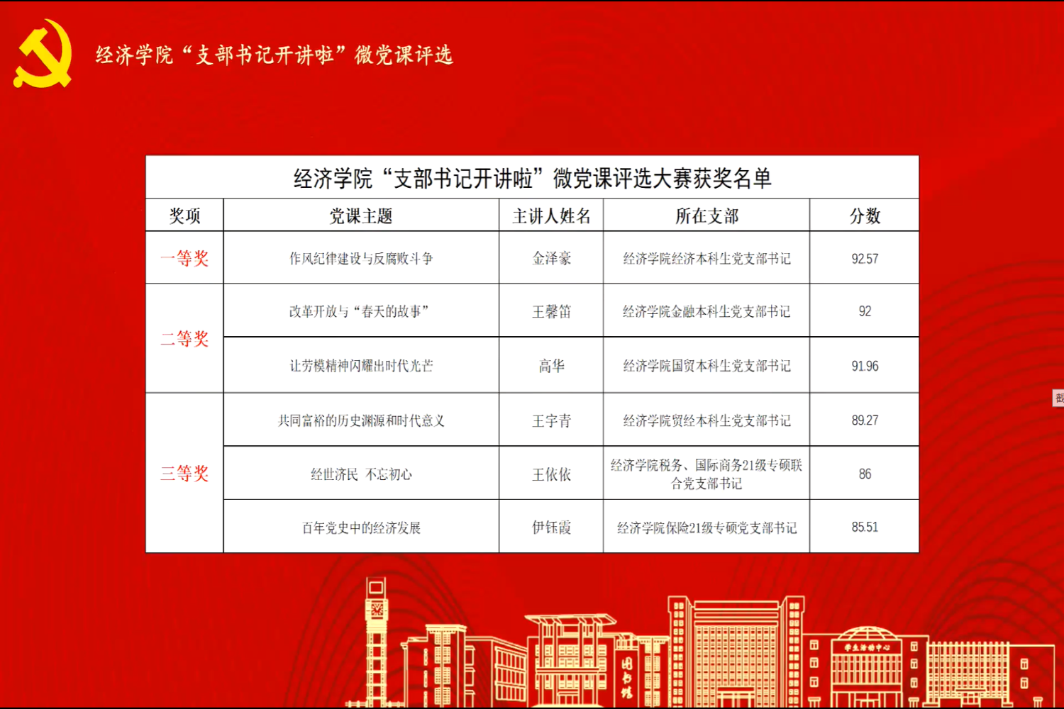 “支部書記開講啦”微黨課評選活動作為經濟學院喜迎黨的二十大系列活動的重要組成部分,用“以講促學、以評促學”的方式,既加強了各學生黨支部書記的理論儲備和示范引領作用,也體現出黨支部的戰斗堡壘作用。經濟學院將以此為契機,深入推動“一支部一品牌”“一院一品”建設,使理論學習常態化,用學生喜聞樂見的方式做好、做實黨建活動,不斷創新,銳意進取,用實際行動迎接我校第三次黨代會,以優異成績迎接黨的二十大勝利召開。