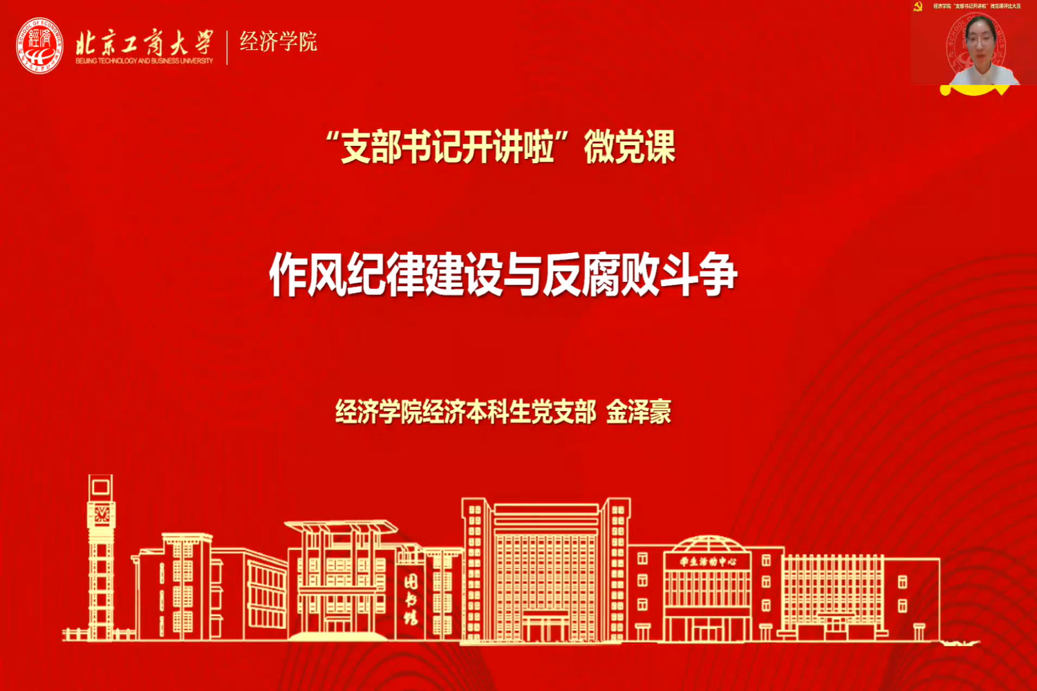 經濟本科生黨支部書記金澤豪帶來微黨課《作風紀律建設與反腐敗斗爭》。她從“銘記黨的廉政歷史”“學習踐行廉政思想”“做新時代廉潔自律的模范”三個方面展開論述。她用鏗鏘有力的話語呼吁廣大學生黨員自覺提高政治站位,嚴守紀律紅線,以良好的精神面貌、純潔的黨性修養、嚴謹的態度、優異的成績回報黨和學校的重托與期望,以擔當詮釋初心,以實干踐行使命,為學校開創特色鮮明的高水平研究型大學建設新局面貢獻一份力量!