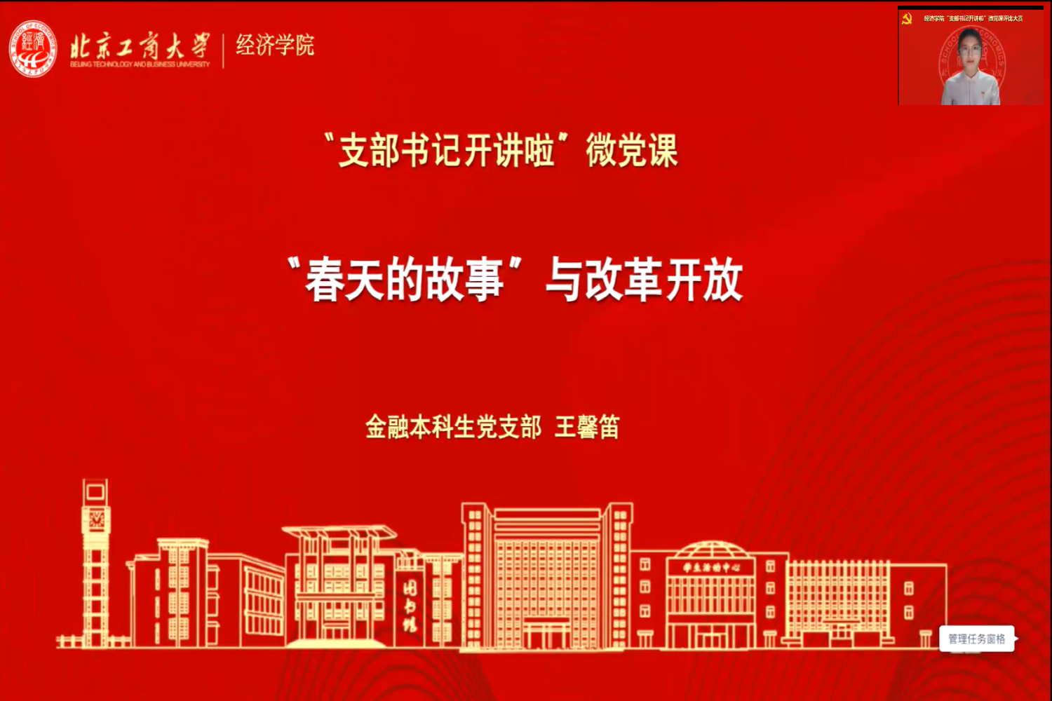 金融本科生黨支部書記王馨笛帶來微黨課《改革開放與“春天的故事”》。她將改革開放分為三個歷史階段,詳細地講述了改革開放是從何改變了國家和人民的面貌,同時鑄就了中國特色社會主義的生機與活力。除此之外,她還闡明了要“續寫春天的故事”,呼吁廣大黨員要高舉中國特色社會主義偉大旗幟,創造無愧于時代的業績。