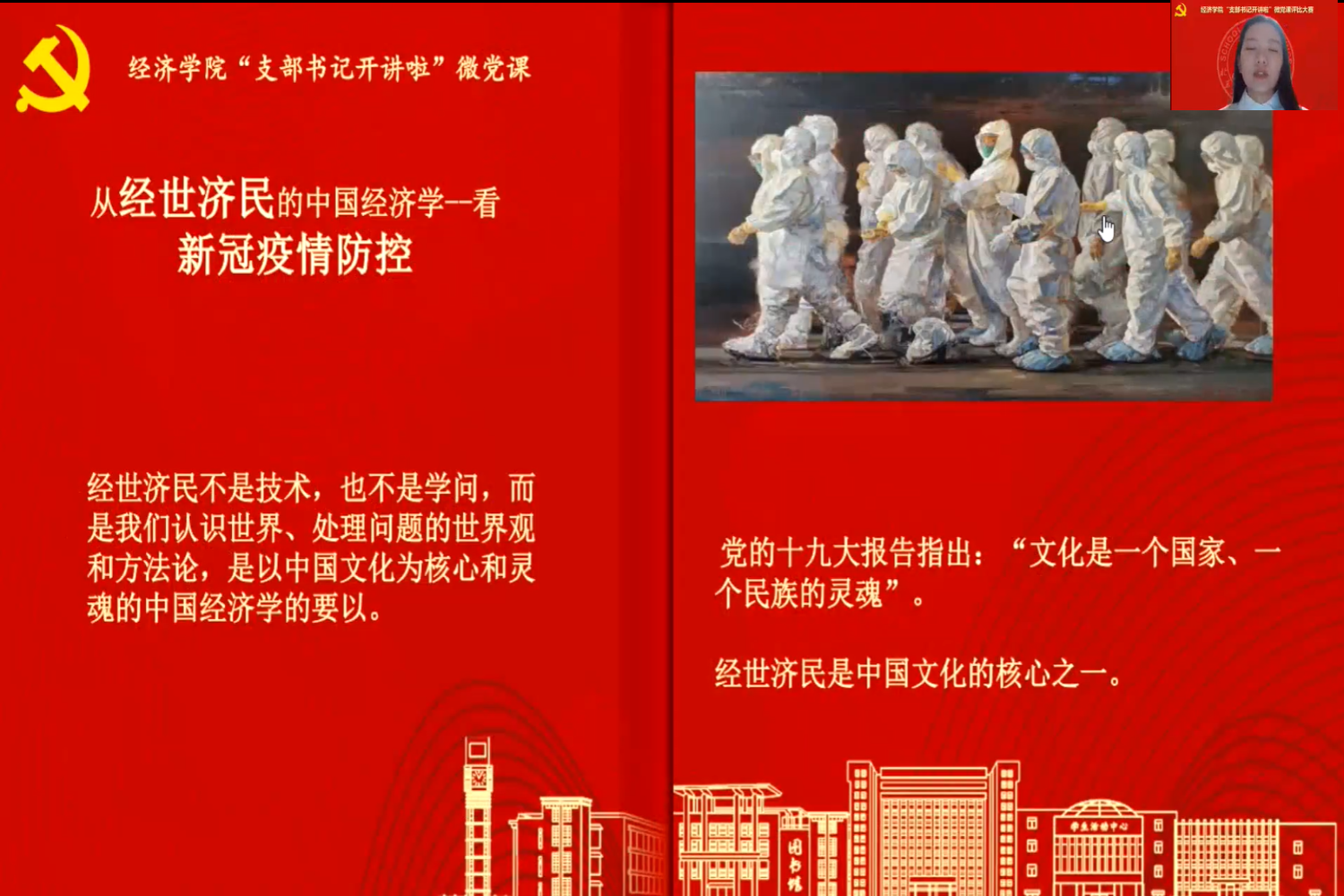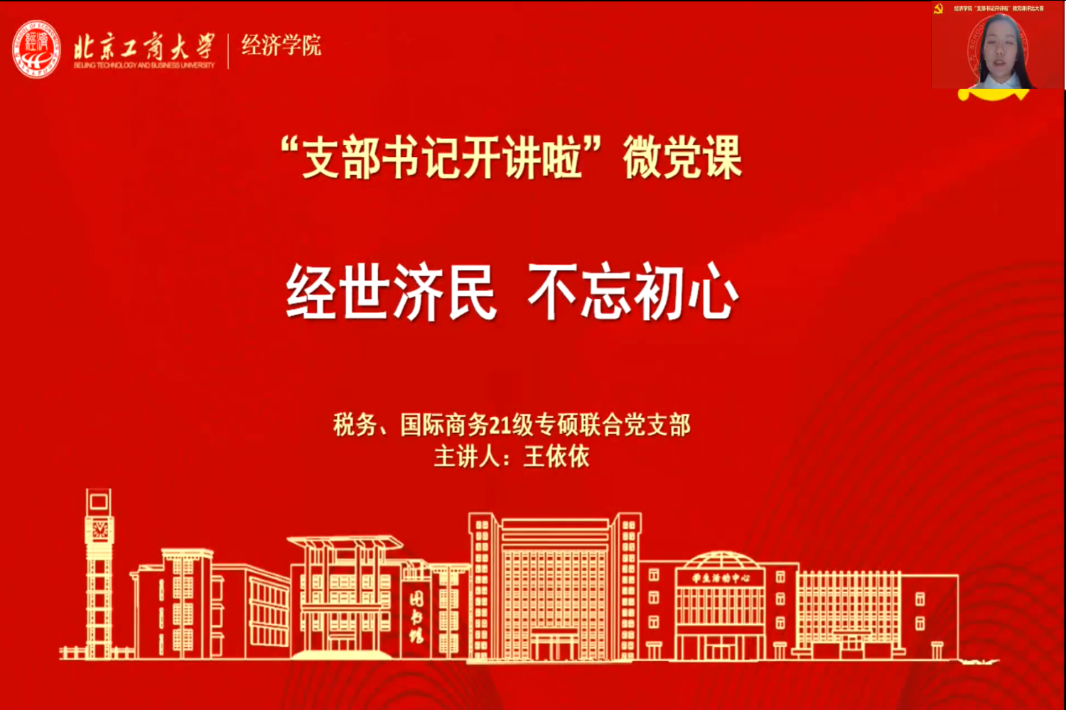 稅務、國際商務21級專碩聯合黨支部書記王依依帶來微黨課《經世濟民 不忘初心》。她以《抱樸子·審舉》作為引入,解釋了“經世濟民”是使社會繁榮、百姓安居的意思,是古代賢士的立世準則。而后,從抗擊新冠疫情和新時代的扶貧實踐兩個案例具體展開論述了新時代中國經世濟民的思想內核——經世的核心在認世、關鍵在管世、目標在濟民。只有正確地認世,才能正確地管世,才能實現濟民的目標。