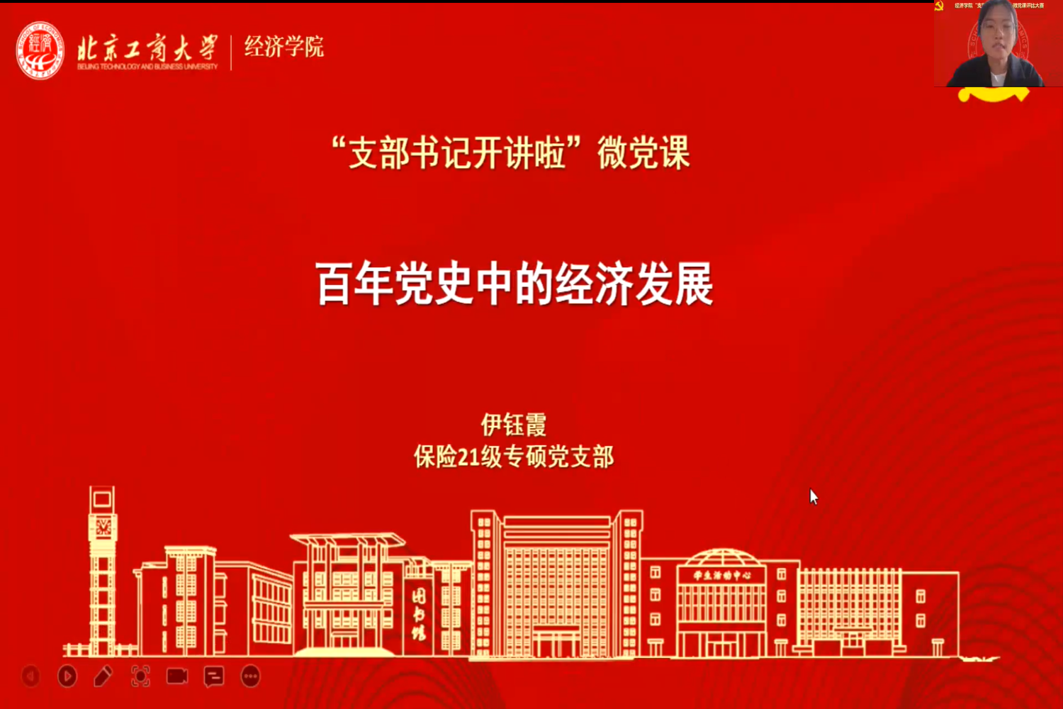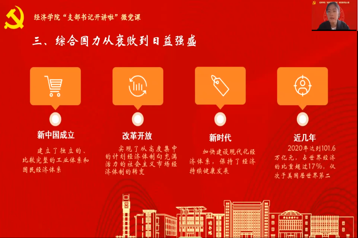 保險21級專碩黨支部書記伊鈺霞帶來微黨課的《百年黨史中的經濟發展》,她從“人民生活貧困到邁向小康”、“主要產品從空白到世界領先”和“綜合國力從衰敗到日益強盛”三部分展開,捋清百年經濟發展脈絡。伊鈺霞表示,我們要堅持以習近平新時代中國特色社會主義思想為指導,增強“四個意識”、堅定“四個自信”、做到“兩個維護”,為實現第二個百年奮斗目標、實現中華民族偉大復興的中國夢奠定堅實物質基礎。