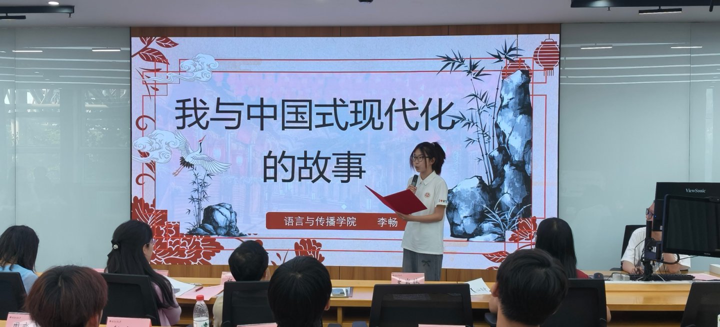 參賽選手各展風(fēng)采。設(shè)計(jì)與藝術(shù)學(xué)院的袁夢(mèng)同學(xué)以精彩的表演和生動(dòng)的講述描繪了普通民眾如何憑借自身的智慧和努力在中國(guó)式現(xiàn)代化的宏大篇章中成為主角;語(yǔ)言與傳播學(xué)院陳昱璇同學(xué)娓娓道來(lái)她記憶中的那座廟、那條河在歷經(jīng)荒蕪和腐臭后在中國(guó)式現(xiàn)代化東風(fēng)里煥然一新;經(jīng)濟(jì)學(xué)院胡云濤同學(xué)則以“素紙”為線索,巧妙地串聯(lián)起百年間南湖紅船上的堅(jiān)定信念、核基地計(jì)算紙上的精密數(shù)據(jù)和當(dāng)代青年手機(jī)備忘錄中的點(diǎn)滴思考,揭示了中國(guó)式現(xiàn)代化中的傳承與創(chuàng)新。