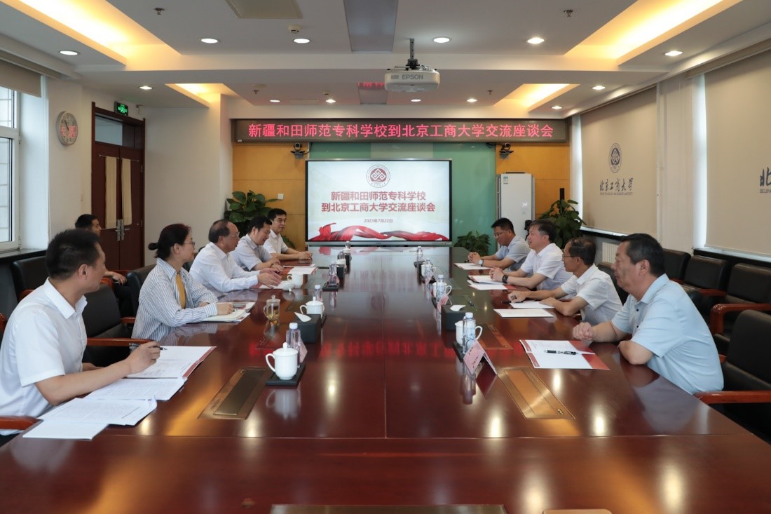 座談會上,雙方觀看了學校宣傳片。黃先開對和田師范專科學校來訪表示熱烈歡迎,并介紹了學校的歷史沿革、辦學特色、目標定位。他表示,北京工商大學作為北京市重點建設的高水平研究型大學,形成了“理工+經管”的工商發展新模式,明確了“商科做強、工科做精、工商融合、雙輪驅動”的學科專業布局定位。他建議兩校相關部門通過精準對接以及對口援疆等方式,促進和田師范專科學校升本工作,同時在專業建設、人才培養、科學研究等方面加強交流合作。