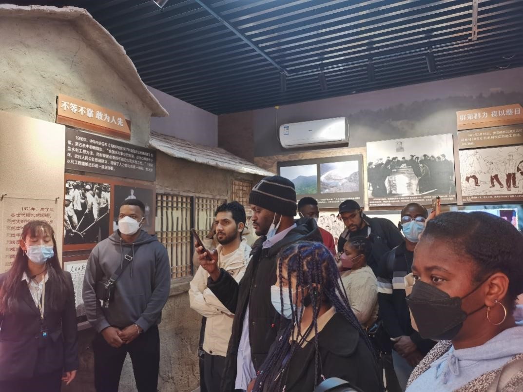 國際學生參觀了南窖鄉花港紅色洞渠展覽館,隨后走訪傳統村落水峪村,當地講解員向國際學生講解了花港村的歷史,介紹了黨支部書記蒲天佑帶領村民開山引水,修渠近萬米的情況,展現了“苦熬不如苦干”的花港精神。國際學生紛紛為花港村不等不靠、敢為人先的精神所震撼。