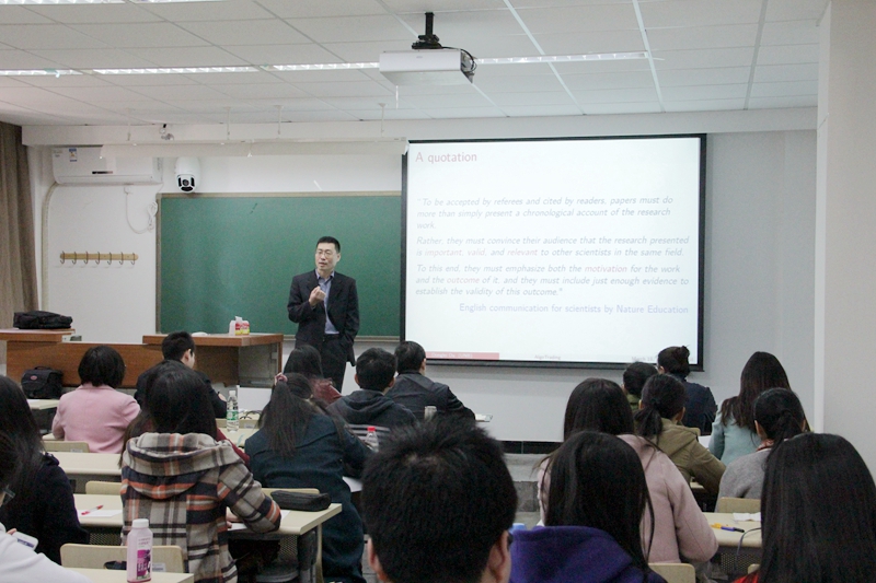 杜東雷教授以如何撰寫英文學術論文(How to write scientific papers in English)為主題,根據自己在國際一流學術期刊上發表論文的經驗,通過分析在英文學術寫作中所遇到的常見問題,詳細講解了英文學術論文寫作中最核心的要點,分享了在英文學術寫作中所遇到的問題。講座結束后,與會學生和教師就自己關心的英文學術論文寫作、英文學術論文在國際期刊上的發表等相關問題與杜教授進行了現場交流。