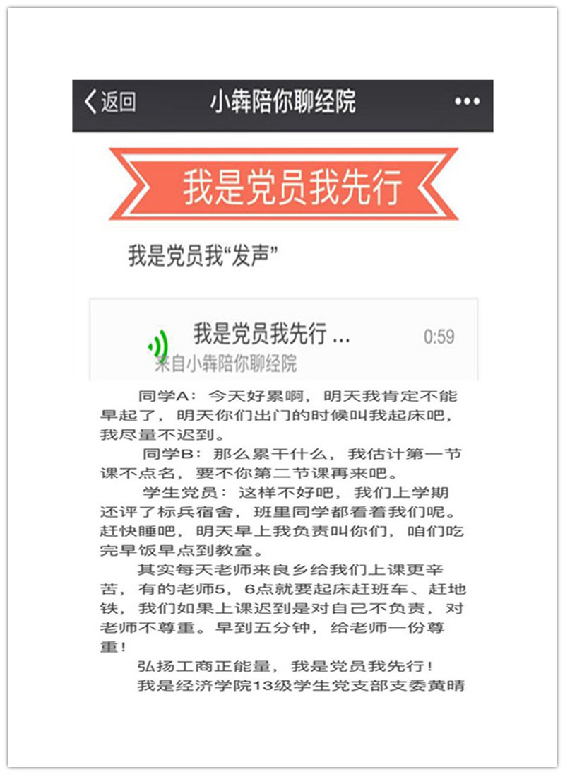 學生黨員勇于“發聲”,通過學院微信平臺“小犇陪你聊經院”,每天推出一期學生黨員“弘揚工商正能量”公益語音活動,由學生黨員錄制1分鐘微音頻,圍繞尊師重道、感恩父母、衛生宿舍、文明禮儀、節約用水、安全用電、走下網絡、走出宿舍、走向操場等為主題展開“發聲”號召,通過線上線下互動結合,向在校學生弘揚工商正能量,傳播核心價值觀。