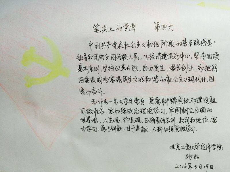 3月初,學院學生黨支部開展了“筆尖流走,手書黨章黨規”活動,旨在通過“抄、展、評”三個環節,引導黨員逐條逐句抄寫黨章黨規和系列講話,牢記入黨誓言,牢記黨的宗旨。活動開展以來,學生黨員積極響應,其中既有極富創意的入黨積極分子的感想,也有書法精湛的預備黨員和正式黨員的作品。他們說,好久沒有認真寫過文字了,通過摘抄一段有感觸的黨章內容,感覺文字靜靜地流進心中,也進一步牢記了黨的全心全意為人民服務的宗旨。