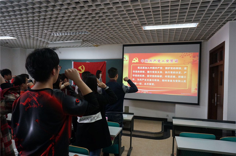 學生黨支部以“認真學習黨章、落實忠誠信仰”為主題開展微黨課活動。會上,全體學生黨員重溫入黨誓詞,大家伴隨國歌,面對黨旗,莊嚴宣誓,以飽滿的精神面貌開始了學習交流。大家就“如何學好黨章黨規”這一問題進行了熱烈的討論,得出了四點共識:“認真學習、自覺遵守、切實貫徹、堅決維護”,大家在輕松愉快的氛圍中感悟著黨章的深刻內涵,堅定了共產主義信仰。
