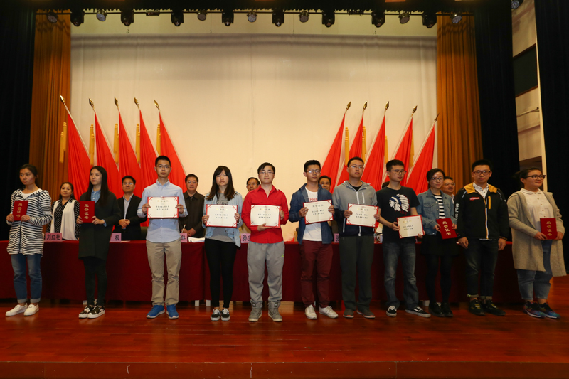 獲得校內(nèi)數(shù)學(xué)競(jìng)賽一等獎(jiǎng)、英語六級(jí)考試優(yōu)秀獎(jiǎng)、英語四級(jí)考試三等獎(jiǎng)、二等獎(jiǎng)、一等獎(jiǎng)的學(xué)生分別上臺(tái)領(lǐng)獎(jiǎng)并與頒獎(jiǎng)的領(lǐng)導(dǎo)、老師合影留念。