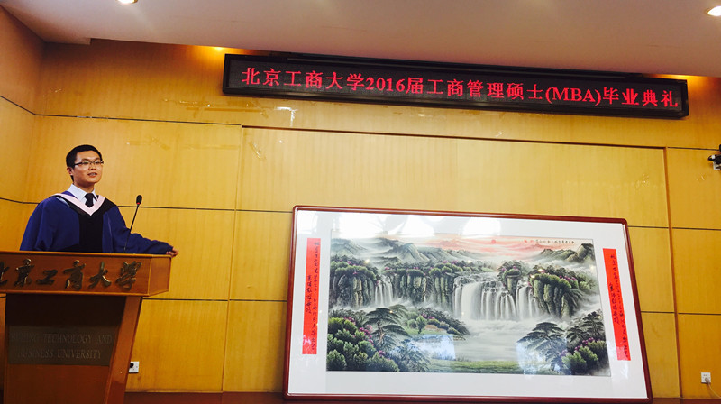 2014級秋季班班長田獻飛代表2016屆MBA畢業生發言,他感謝母校的培養和幫助,難舍兩年的工商生活和同窗情誼,今后會更加努力地生活和工作,不辜負母校和老師的殷切希望。