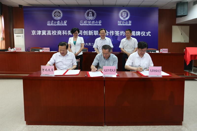 成立大會上,我校副校長謝志華、天津財經(jīng)大學(xué)校長李維安、河北大學(xué)黨委副書記王余丁聯(lián)合簽署了合作協(xié)議,譚向勇、李維安、王余丁共同為“京津冀高校商科類協(xié)同創(chuàng)新聯(lián)盟”揭牌。