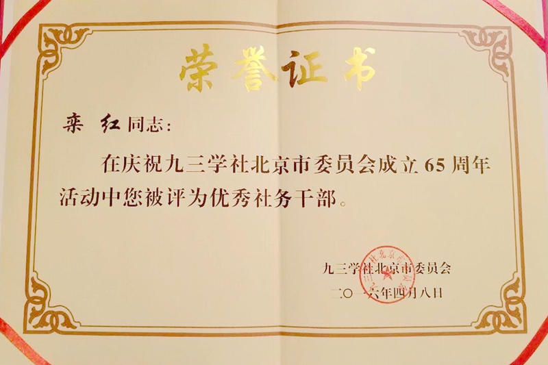 欒紅副教授任九三學(xué)社北京市婦女委員會委員、北京九三學(xué)社第四綜合支社宣傳委員。多年來,她一直從事人才培養(yǎng)、科學(xué)研究的一線工作,利用專業(yè)優(yōu)勢服務(wù)社會,積極參政議政,認(rèn)真履行職責(zé),為學(xué)校的發(fā)展積極建言獻(xiàn)策。