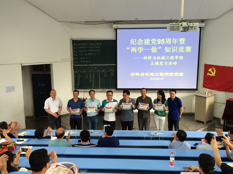 為慶祝建黨95周年,提高黨員的學習熱情,深入推進“兩學一做”學習教育工作, 6月29日,材料與機械工程學院在阜成路校區舉行了紀念建黨95周年暨“兩學一做”知識競賽活動。來自學院4個教職工黨支部的60余名黨員參加了活動。