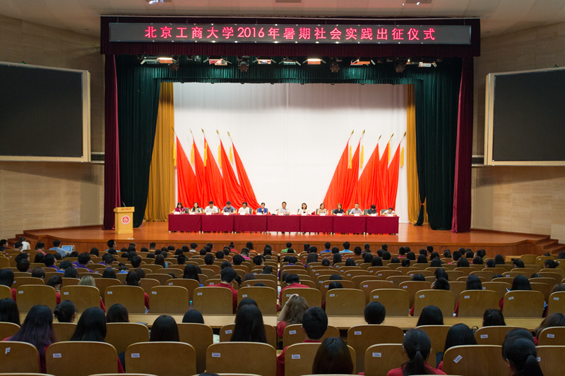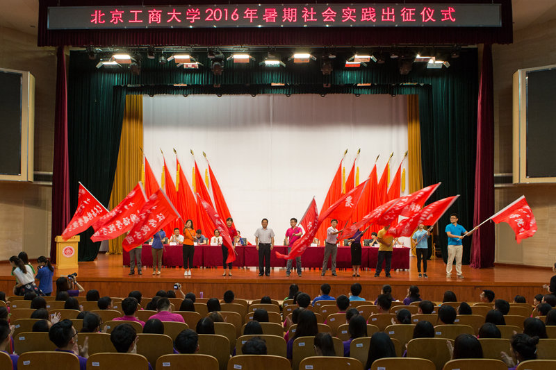 在國歌聲中,出征儀式拉開帷幕。團委書記王海偉介紹了我校2016年暑期社會實踐基本情況。今年我校開展以“青年服務國家——投身助力十三五,青春奮進中國夢”為主題,以理論學習、政策宣講、基層建設、走訪調研、志愿服務為主要形式的暑期社會實踐。本次實踐分為集中實踐和分散實踐。集中實踐包括“十鄉百村千人行”暑期社會實踐團、房山區暑期高校大學生社會實踐團、“社區青年匯新青年學堂”成人高考培訓實踐團、思想教育主題實踐團、暑期大學生志愿服務實踐團,赴英國牛津大學學生培訓實踐團以及服務騰沖暑期聯合社會實踐團等七個團隊。其中青年志愿者協會敬老愛老志愿服務團和服務騰沖暑期聯合社會實踐團還入選了北京市暑期社會實踐百強團隊。王海偉表示今年是十三五規劃的開局之年,希望將社會實踐打造成第二課堂的育人品牌,引導幫助更多學生在實踐中成長。