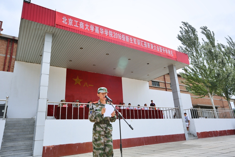 軍訓團五連、金融與貿易學院王嘉晨同學在代表參訓新生發言中,對入學以來悉心教導照料他們的所有領導、老師和教官們表達了崇高的敬意和由衷的感謝,并代表2016級全體新生承諾會在今后的大學生活中明確目標,發憤圖強,迎接新的起點,努力把自己塑造成為一名新時代的高素質人才。