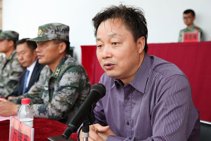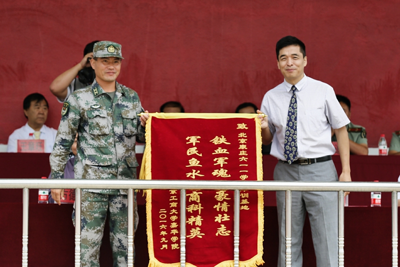 典禮上,出席大會的領導為軍訓教官贈送了紀念品,嘉華學院黨委書記張曉磊向北京康莊611訓練基地贈送了錦旗。