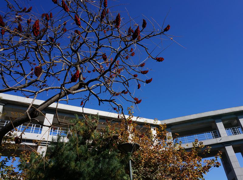 火炬樹,漆樹科鹽膚木屬植物,花序頂生,核果呈現深紅色,形狀似火炬,主要分布于良鄉校區圖書館南側,6棵,校長樓北側,5棵。