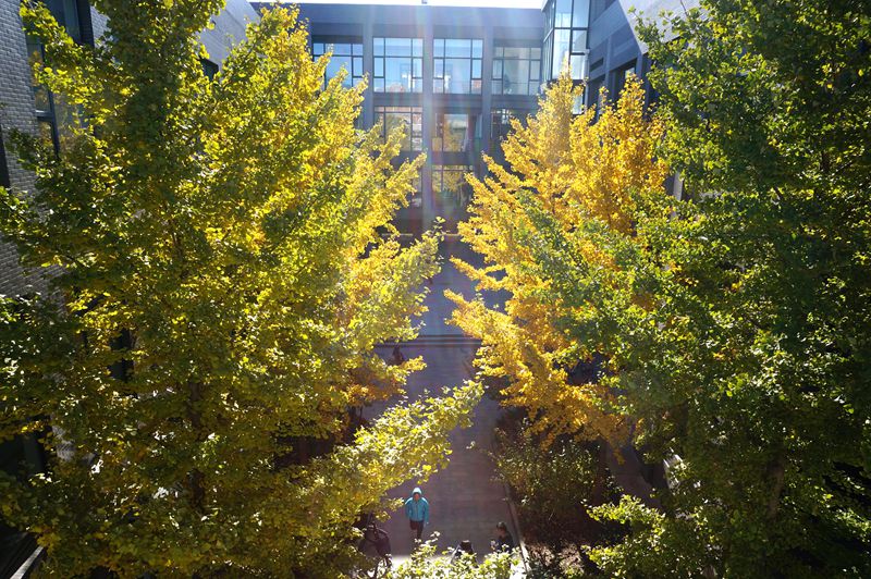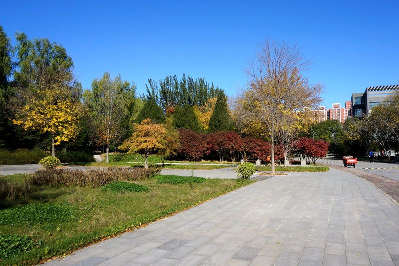 銀杏,落葉喬木,是我國獨有的庭茵樹種,也是世界上最古老的孑遺植物。銀杏樹高大挺拔,氣勢非凡,是我國最主要的秋季觀賞樹木。銀杏枝葉輻射狀散生,葉扇形,夏季呈翠綠色,初秋是黃綠色,落葉前變成了金黃色。我校的銀杏樹主要位于阜成路校區綜合樓附近的道路兩側,共計29棵,良鄉校區銀杏共有132棵,以文二樓樓宇之間的道路兩側銀杏為佳。這兩處的銀杏樹樹齡較長,枝葉繁盛,形成了極好的銀杏道景觀。陽光正好的秋日,漫步在金黃漫地的銀杏道上,抬頭望去,那目光所及的燦燦金黃與湛藍的天空相映成輝,總能帶給人一種歲月靜好,時光荏苒的沉靜之美。