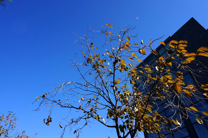 柿子樹:柿樹科柿樹屬,通常高達10米以上,枝四散開展,葉子為橢圓形,是秋季主要觀賞果實植物,秋季果實呈現橙黃色,可食用。我校的柿子樹主要位于阜成路校區東區1號樓旁,1棵,良鄉校區位于工三樓西側,30棵。我校種植的柿子樹數量并不多,十月初柿子成熟時,圓大明亮的柿子掛滿樹梢煞是好看,霜降之后,只剩下零星的幾粒柿子寂寞地掛在梢頭,倒也有一種蕭瑟之美。