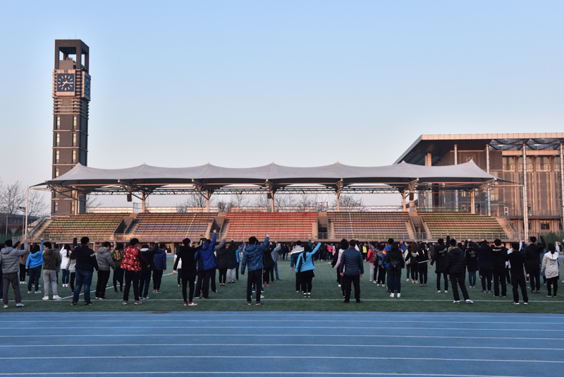 在行政樓西側籃球場,印有“犇騰經院,展翅飛翔,相約晨曦,強身健體”的條幅十分醒目。經濟學院輔導員王賽男老師正在積極地給每個班的班長安排任務,隨后班長帶領著每個班的同學開始進行熱身運動。在生活區(qū)西側二期主路上活動的商學院,記者發(fā)現很多大二的學生干部也參與其中,每個部門組織的活動豐富多彩,學生可以根據自己的喜好來進行選擇。文科實踐中心北側廣場上,外語學院同學已經跑完兩圈,開始做伸展運動了。“我們會做一些keep上的運動來進行晨練,雖然早起有點痛苦,但運動完之后感覺很有活力。”商務英語161李雅妮說到。