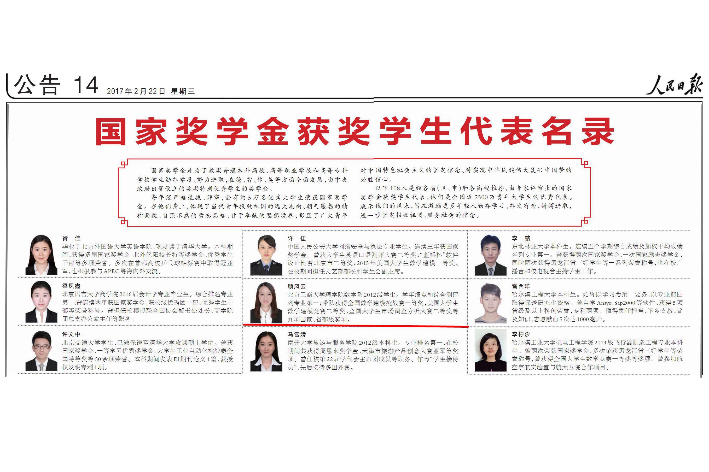 2月22日,《人民日報》刊登了《國家獎學金獲獎學生代表名錄》,遴選展示了經各省(區、市)和各高校推薦、專家評審出的全國108名獲獎代表。我校國家獎學金獲得者理學院數學系2012級學生顧風云作為北京市屬高校唯一代表位列其中。