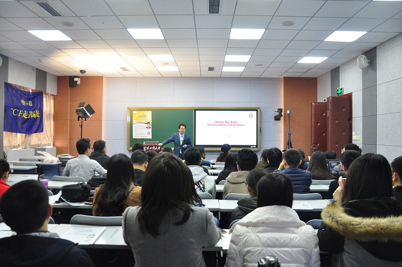 報(bào)告會(huì)全部用英文進(jìn)行,還通過(guò)手機(jī)網(wǎng)絡(luò)平臺(tái)進(jìn)行了直播。在講座中,袁曉如教授介紹了在現(xiàn)代社會(huì)大數(shù)據(jù)處理和分析的困難性,以及可視化方法對(duì)公眾和決策者的重要性。袁教授系統(tǒng)的介紹了其團(tuán)隊(duì)在城市交通數(shù)據(jù)可視化方面的多個(gè)案例,其使用的數(shù)據(jù)集包括出租車(chē)GPS、RFID記錄、IC卡、手機(jī)信號(hào)和社交媒體數(shù)據(jù)。通過(guò)合理的可視化手段,專家可以進(jìn)行交互式的數(shù)據(jù)探索工作。通過(guò)袁曉如教授圖文并茂、耐心細(xì)致的講解,多種城市交通可視化方法的思路、布局、方法、結(jié)論一一展現(xiàn)在聽(tīng)者面前。隨后袁教授還講解了大數(shù)據(jù)分析在當(dāng)前社會(huì)環(huán)境下的重要意義。