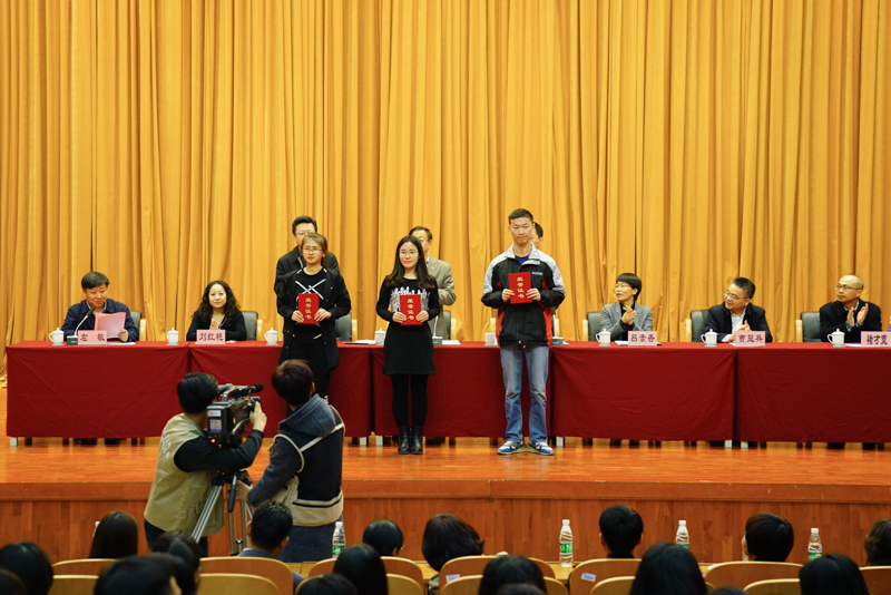 副校長李朝鮮宣讀了《北京工商大學關于表彰2016年12月份全國大學英語四六級考試成績優異學生及2016年秋數學競賽獲獎學生的決定》。此次學校表彰了114名大學英語四六級考試成績優異的學生,其中英語四級一等獎7人、二等獎15人、三等獎25人、優秀獎64人,英語六級優秀獎3人;表彰了25名在美國大學生數學建模競賽、國家大學生數學建模競賽、國家大學生數學競賽中獲獎的學生;還表彰了90名在校內數學競賽中獲獎的學生。在師生們的掌聲中,獲獎學生分別上臺領獎并與頒獎的領導、老師合影留念。