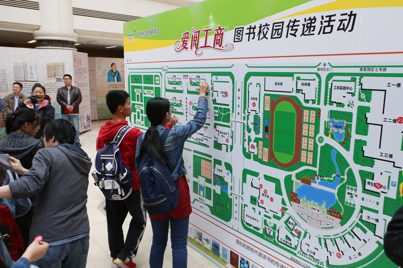 作為本屆讀書節(jié)主打活動之一的“愛閱工商”圖書校園傳遞活動在開幕式中啟動。師生票選產(chǎn)生的首批30本優(yōu)秀圖書,由方德英副校長及與會嘉賓交于學(xué)生圖書推薦人,推薦人在校園地圖上標記將要放置圖書的位置,并在儀式后將圖書傳出。活動啟動一天以來,已有許多同學(xué)通過微博、微信“曬”傳出和找到傳遞書的消息、位置及照片。