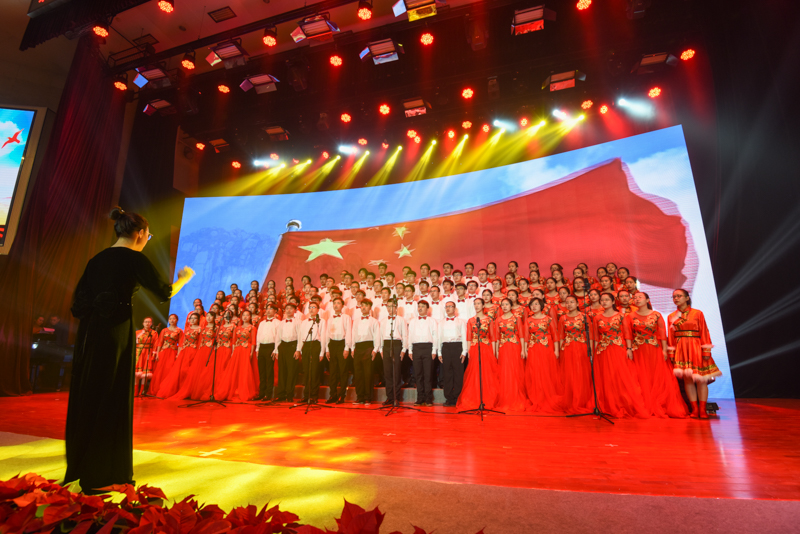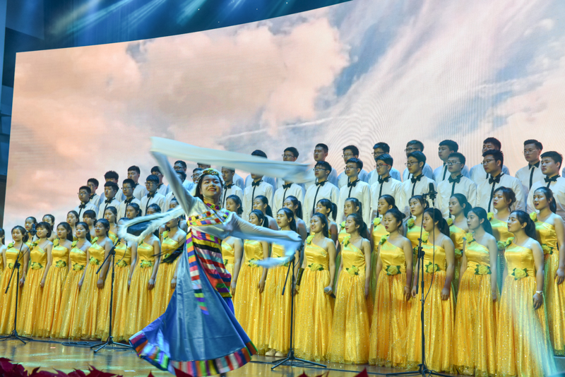 法學(xué)院、商學(xué)院、經(jīng)濟(jì)學(xué)院分別帶來《唱支山歌給黨聽》《我們的生活充滿陽光》《沒有共產(chǎn)黨就沒有新中國》等,與在場觀眾一同回望那段被鮮血與汗水澆灌的歷史,感懷新時代的絢麗多彩。與此同時,自選曲目表演也精彩紛呈。法學(xué)院的《達(dá)坂城的姑娘》活潑俏皮,商學(xué)院的《青春舞曲》熱情洋溢,經(jīng)濟(jì)學(xué)院的《掀起你的蓋頭來》動感輕快。同學(xué)們身著少數(shù)民族特色服飾,踏著音樂起舞,用他們積極向上的風(fēng)貌向黨看齊。