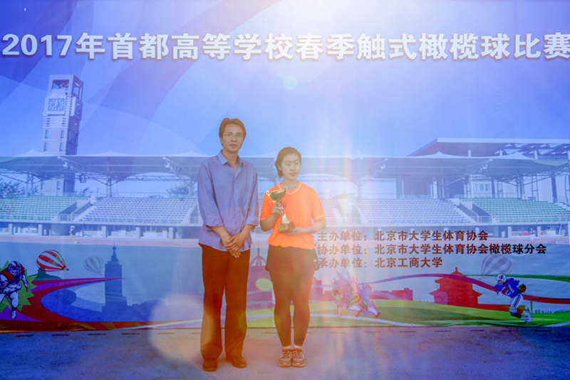 北京市大體協橄欖球分會秘書長束錦丹在講話中對觸式橄欖球走進北京工商大學表示祝賀,希望這項運動能夠推廣,并表達了對運動員的殷切期望。我校體育與藝術教學部主任呂良在發言中對到場的各位以及全體工作人員表示感謝,并表揚了運動員們拼搏奮斗的精神。隨后與會嘉賓為獲獎代表隊頒獎。