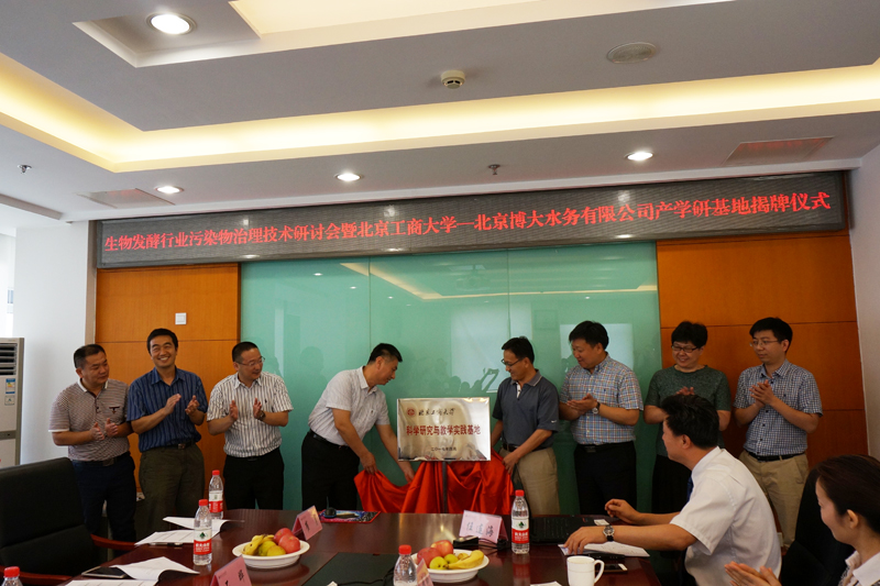 徐寶財(cái)首先對(duì)各位嘉賓的到來(lái)表示熱烈歡迎,對(duì)中國(guó)生物發(fā)酵產(chǎn)業(yè)協(xié)會(huì)及北京博大水務(wù)有限公司長(zhǎng)期以來(lái)對(duì)學(xué)院工作的支持表示感謝,認(rèn)為召開生物發(fā)酵行業(yè)污染物治理技術(shù)研討會(huì),搭建協(xié)會(huì)、高校、企業(yè)間的產(chǎn)學(xué)研交流平臺(tái)是合適與必要的。蔣玉明與任連海分別就各自情況及產(chǎn)學(xué)研基地前期準(zhǔn)備情況作了介紹。蔣玉明與徐寶財(cái)共同為北京工商大學(xué)-北京博大水務(wù)有限公司產(chǎn)學(xué)研基地揭牌,宣布兩家單位之間的合作正式啟動(dòng)。