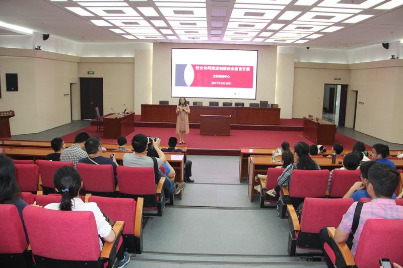 隨后,郭馨梅主任在模擬法庭做了《校企協同推進創新創業教育開展》的專題報告。她介紹了學校的基本情況和文科實踐中心發展歷程,著重從環境、平臺、課程、師資、教學、競賽與實踐等創新創業教育六個構成要素,與大家分享了校企協同推進創新創業教育的開展情況,并就學校內部多部門協同、創業教育與專業教育的對接、理論教學與實踐教學的互補、賽教一體化等內容進行了交流互動。