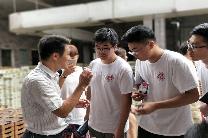 在北京味食源有限公司,實踐團成員在公司負責人帶領下,參觀了生產車間和研發中心,對食品香精香料的生產工藝流程進行了初步了解。在參觀過程中,同學們深刻感受到了自動化生產帶來的高效率,同時,結合本次實踐環保主題,對生產過程中的廢水、廢氣、廢料處理和回收等問題展開了積極討論學習。