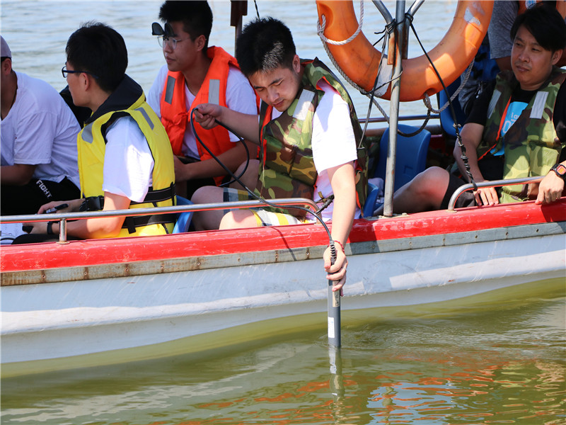 在白洋淀北淀和南淀地區,實踐團懷著飽滿的熱情,乘船前往22個國控和省控監測點對生態、水質、大氣和噪聲四個方面進行數據測量和采樣。兩位帶隊老師認真指導隊員們的實踐工作,及時提出意見,幫助成員們更好的測量數據。每日馬不停蹄的監測工作結束后,實踐團又馬上投入到緊張的數據整理及分析工作中。