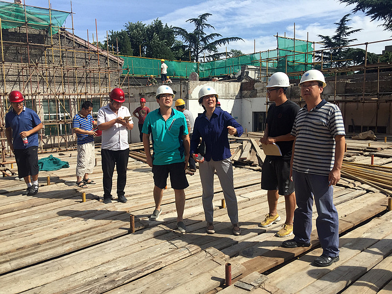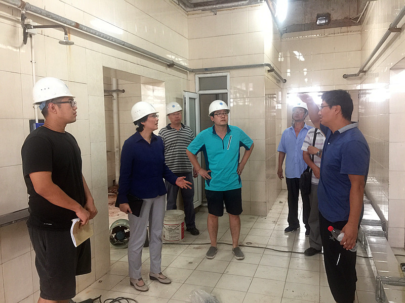 在施工工地現(xiàn)場,張耘副校長聽取了有關(guān)項目改造內(nèi)容、施工組織設(shè)計、安全生產(chǎn)管理、進度計劃等情況的匯報,就發(fā)現(xiàn)的一些問題提出意見和工作要求,并向保障我校暑期改造項目安全順利運行的設(shè)計、監(jiān)理、施工單位和一線工人表達親切的慰問。了解到在改造工程施工期間,后勤基建處要求各方配合采用科學手段進行流水作業(yè)及交叉施工,克服主材加工訂貨周期長及各專業(yè)工程工序工期不可壓縮的困難,努力做好應(yīng)對連續(xù)多次強降雨的安全防護措施。為確保改造后短時間達到教學科研的使用條件,建筑內(nèi)墻涂料均采用環(huán)保型無醛水性涂料;在公用區(qū)域及部分功能房間采用新型LED節(jié)能光源,讓建筑做到了“低能耗、高照度”;對兩棟以教學科研為功能體現(xiàn)的建筑進行水電改造,建造“樹形”增容系統(tǒng),為今后教學科研設(shè)備的添置和使用提供條件保障。