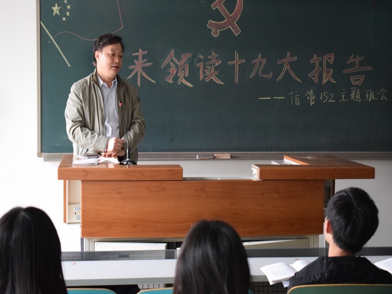 班會最后,方德英副校長以微黨課的形式與大家分享他自己學(xué)習(xí)十九大報(bào)告的感想。“我們是相像的,因?yàn)槲液屯瑢W(xué)們學(xué)習(xí)的是相同的專業(yè),只不過我比同學(xué)們早了30年而已”。親切而幽默的話語一下子活躍了課堂的氛圍,他表示,能來信管152班的班會傾聽同學(xué)們對于十九大精神的理解是一件很幸運(yùn)的事情,“感覺同學(xué)們對十九大的理解還是比較深刻的,同學(xué)們從家鄉(xiāng)人民生活的變化、國際國內(nèi)形勢、影視作品、旅游見聞等大學(xué)生視角,對十九大從不同方面進(jìn)行了解讀,談出了自己的見解,更進(jìn)一步堅(jiān)定了理想信念,這種形式非常好,班會時(shí)間有限,發(fā)言的同學(xué)還不是很多,以后這種形式的班會可以經(jīng)常組織”。他還指出,黨的十九大是一次開啟新時(shí)代的大會,做出了“兩個一百年”的戰(zhàn)略部署,它既總結(jié)了中國過去的發(fā)展歷程,又規(guī)劃了中國未來的發(fā)展方向,到建國100年時(shí),我們要建成社會主義現(xiàn)代化強(qiáng)國,在學(xué)習(xí)過程中大家都非常憧憬那個時(shí)代的強(qiáng)大祖國和美好生活,但是,這不是敲鑼打鼓就能實(shí)現(xiàn)的,我們學(xué)習(xí)十九大精神,最后的落腳點(diǎn)是要落實(shí)到行動上。希望同學(xué)們認(rèn)真貫徹落實(shí)十九大精神,能在最美的年華,努力學(xué)習(xí),加強(qiáng)自律,不辜負(fù)這美好的時(shí)光,在這嶄新的時(shí)代綻放出最耀眼的光芒!