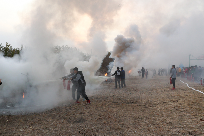 此次活動旨在全面實(shí)施“平安校園”建設(shè)提升工程,提高全校師生防火安全意識和火場逃生自救的能力,確保學(xué)校秋冬季防火安全。在現(xiàn)場執(zhí)行指揮保衛(wèi)處副處長楊東杰的指揮下,消防疏散演習(xí)正式開始,消防警報同時鳴響,模擬接到火災(zāi)報警后,保衛(wèi)處立即啟動微型消防站拉動,按照“1分鐘響應(yīng)”“3分鐘到場”撲救初起火災(zāi)的要求,消防應(yīng)急隊員駕駛微型電動消防車迅速到達(dá)火場實(shí)施滅火。參演學(xué)生從學(xué)生宿舍快速疏散到集結(jié)區(qū),完成了火災(zāi)逃生疏散,反映了學(xué)校在學(xué)生安全教育工作的良好成果。現(xiàn)場還設(shè)置了“消防逃生體驗帳篷”,用于真實(shí)模擬逃生過程,參演學(xué)生踴躍參與體驗。隨后,楊東杰副處長為參演同學(xué)講解滅火器的使用方法,同學(xué)們進(jìn)行了滅火演練實(shí)操。