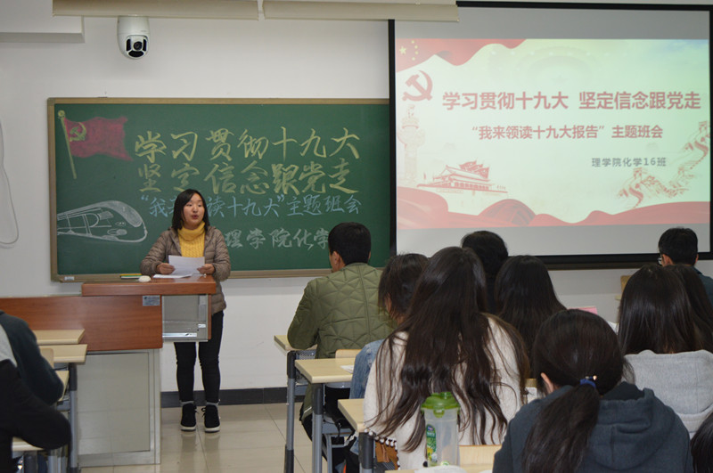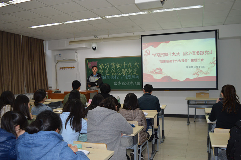 為學(xué)習(xí)貫徹黨的十九大精神,引導(dǎo)學(xué)生深化思想認(rèn)識(shí),強(qiáng)化四個(gè)自信,理學(xué)院在所有本科生班級(jí)中組織開(kāi)展“學(xué)習(xí)貫徹十九大堅(jiān)定信念跟黨走——我來(lái)領(lǐng)讀十九大報(bào)告”主題班會(huì)活動(dòng)。化學(xué)16班于11月9日召開(kāi)了主題班會(huì),學(xué)校副校長(zhǎng)張?jiān)拧W(xué)院黨委書記祝鈞、輔導(dǎo)員張艷婷參加了班會(huì),班會(huì)由班主任周威老師主持。