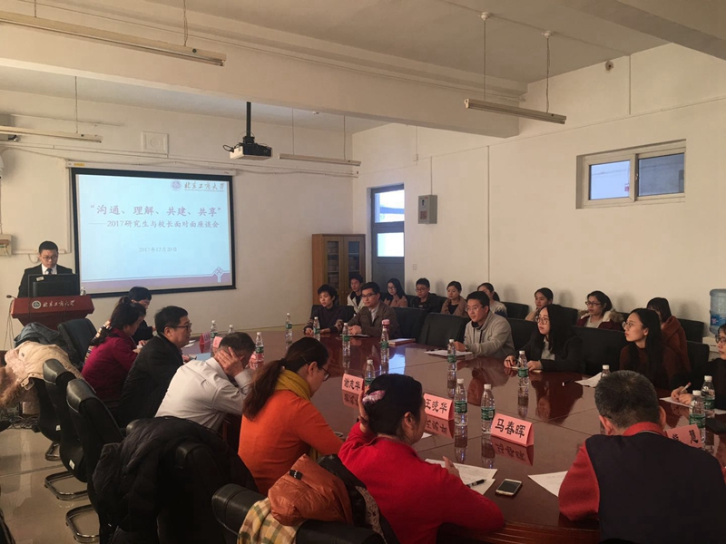 熊慧強調(diào)研究生代表們的發(fā)言各有側重,提出的問題中肯、客觀,極具代表性,并感謝校領導親臨現(xiàn)場和研究生面對面交流,感謝各職能部門領導和老師對研究生工作的支持和理解。她談到,學生的主體地位越來越受到學校的重視,今年學校出臺了《北京工商大學研究生活動管理規(guī)定》(校發(fā)2017[67]號),其中特別強調(diào)了研究生參與學校治理的權利,希望研究生會作為廣大研究生的代表,牢記全心全意為全體研究生服務的宗旨,建立定期反饋研究生意見和建議的機制,為學校發(fā)展建設多提可行性提案,并及時報送相關部門。希望研究生們能多一份包容和理解,當前學校還處于發(fā)展時期,有些問題受到客觀條件制約不能立刻解決,但學校始終關注研究生的發(fā)展,并一直努力改善大家的學習和生活環(huán)境。她希望師生能夠加強溝通理解,直面困難和問題,協(xié)同努力奮進,才能共享建設成果,促進研究生成長成才。她預祝同學們能在新的一年里取得新的進步。