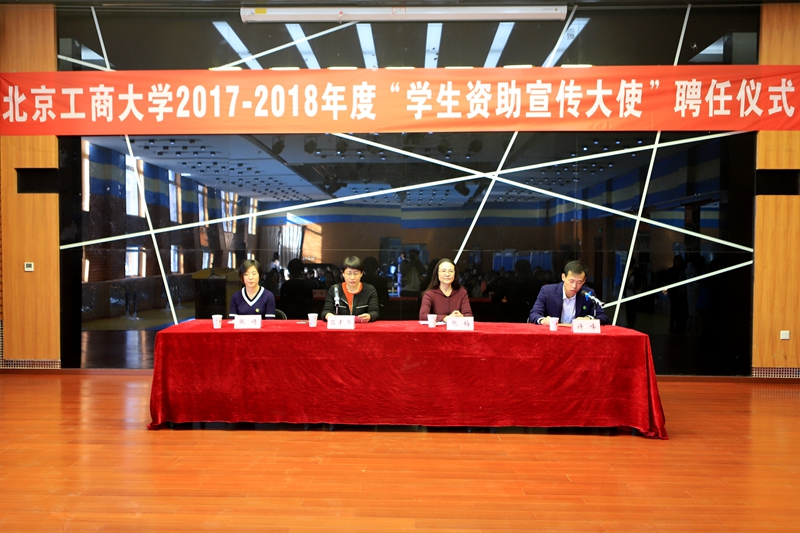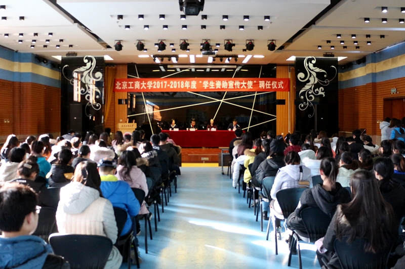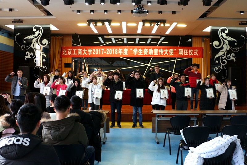 儀式在雄壯的國歌聲中拉開帷幕。呂素香處長首先宣讀了《關于聘任北京工商大學2018年度“學生資助宣傳大使”的決定》,并和張梅副主任共同為20名新聘任的“學生資助宣傳大使”頒發聘書及徽章。20名資助大使在全場老師和同學面前莊嚴宣誓:要做勵志成才的先行者、資助政策的學習者、資助政策的傳播者和知恩、感恩的踐行者。隨后,學生資助中心副主任張倩老師對“學生資助宣傳大使”的工作要點進行了說明;計算機與信息工程學院劉暢同學分享了被聘任為學校首批“學生資助宣傳大使”的喜悅和感悟;理學院國家獎學金獲得者郭實秋、經濟學院國家勵志獎學金獲得者李雪兒進行了資助宣傳模擬宣講。她們結合自身成長經歷,講述了如何在國家資助政策的幫扶下刻苦學習,從自卑走向自強,最終獲得國家級獎學金的心路歷程,贏得了現場觀眾熱烈的掌聲。