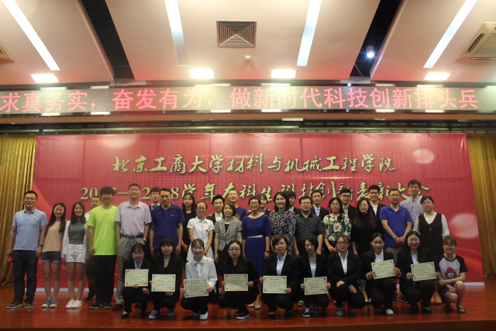 表彰大會上,學院黨委副書記楊秀萍宣讀了《北京工商大學材料與機械工程學院關于表彰2017—2018學年本科生科技創新優秀個人、優秀團隊及優秀指導教師的決定》。根據《材料與機械工程學院關于鼓勵師生參加課外科技創新活動的獎勵辦法》,學院決定:授予材料141班位博宇等40名同學2017-2018學年本科生科技創新優秀個人;授予機械創新設計大賽團隊等17個創新團隊2017-2018學年本科生科技創新優秀團隊榮譽稱號;授予霍亮生、冷崇杰、杜秋月、王雯靜、王建利、董秀萍、樊保民、谷勇霞、許博、趙罘十位教師2017-2018學年本科生科技創新優秀指導教師光榮稱號。溫變英老師、辛洪兵老師和王向東書記分別為本科生科技創新優秀個人、本科生科技創新優秀團隊、本科生科技創新優秀指導教師頒獎。