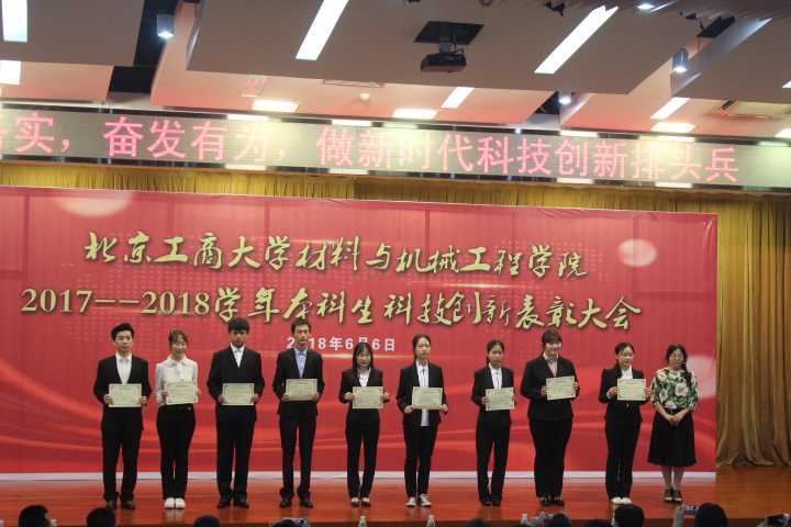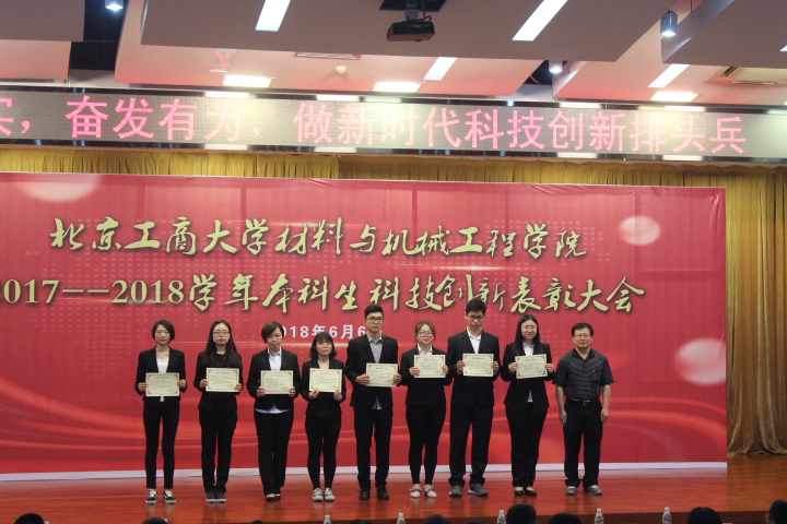 6月6日,材料與機械工程學院2017-2018學年本科生科技創新表彰大會在良鄉校區舉行。學院黨委書記王向東、黨委副書記楊秀萍、材料科學與工程系主任溫變英、包裝工程系主任辛洪兵、學院輔導員、優秀指導教師代表以及學院16、17級學生參加表彰大會。