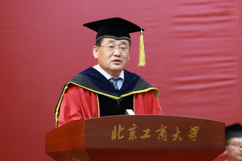 校長孫寶國院士在畢業(yè)致辭中說:今天是夏至,是一年中白晝最長的一天,我們今天舉行畢業(yè)典禮,送同學(xué)們離開母校,開始人生新的征程,寓意深長,它意味著同學(xué)們研究生期間建立起來的同學(xué)情、師生情、母校情情深誼長。他代表學(xué)校黨委和行政向圓滿完成學(xué)業(yè)的博士、碩士畢業(yè)生表示熱烈祝賀,向為學(xué)生的成長付出辛勤汗水的導(dǎo)師和全體教職工致以崇高的敬意和親切的問候。孫校長肯定了2018屆畢業(yè)研究生在學(xué)期間致力于科學(xué)研究和技術(shù)創(chuàng)新,用辛勤付出換來的豐碩成績。他談到,2018屆研究生共取得科研成果829項,其中SCI收錄論文81篇,較去年增長52.8%;EI收錄論文60篇;CSSCI收錄論文84篇,核心期刊176篇。授權(quán)發(fā)明專利21件,較上屆增長17%;39人考取博士研究生,其中17人考取了世界500強的大學(xué);共獲得26項省部級以上各類學(xué)術(shù)競賽獎勵。他希望大家在工作、學(xué)習(xí)、生活中繼續(xù)發(fā)揚能吃苦、敢打硬拼的精神,攀登人生新的高峰。孫校長談到,畢業(yè)生在校期間是學(xué)校全面提升人才培養(yǎng)質(zhì)量,深化教育教學(xué)改革推進轉(zhuǎn)型發(fā)展的關(guān)鍵時期,見證了學(xué)校博士授予點的獲批,學(xué)校將在未來不斷推進“雙一流”建設(shè),希望同學(xué)們繼續(xù)關(guān)注母校的發(fā)展。同時,他勉勵同學(xué)們吃苦耐勞、不怕吃虧,擁有人生的大智慧,并希望大家以健康為本,堅持鍛煉,以旺盛的精力投入工作和學(xué)習(xí)。最后,孫校長寄語畢業(yè)生,希望大家在國家建設(shè)、民族復(fù)興的偉大事業(yè)中大顯身手、大有作為,實現(xiàn)人生的理想與抱負(fù),以驕人的成績,伴隨祖國與母校,共赴輝煌!