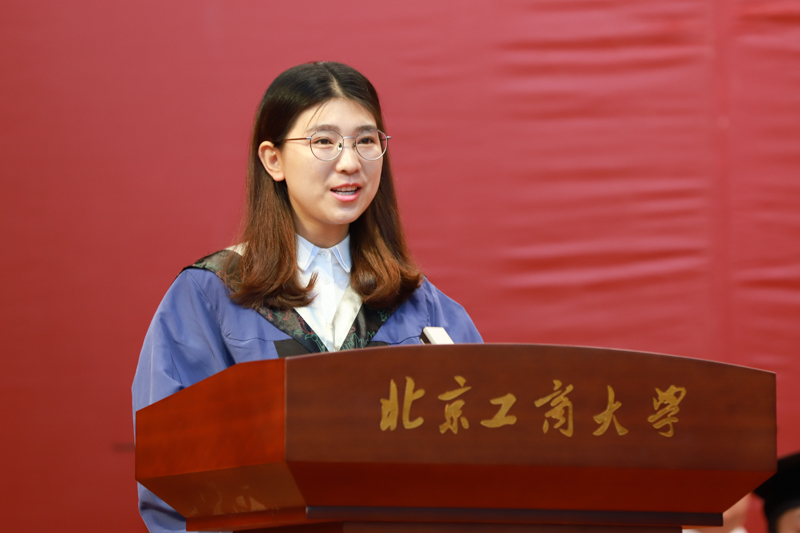 畢業(yè)生代表、理學(xué)院2018屆碩士畢業(yè)生杜姜楠在發(fā)言中代表全體研究生畢業(yè)生對母校的辛勤培育、老師的殷切教導(dǎo)表示衷心的感謝。她回顧了在校學(xué)習(xí)、生活的點點滴滴,感謝母校這片熱土提供給廣大研究生寬廣的平臺,并表示為母校取得博士學(xué)位授予點感到驕傲和自豪。她用九個感謝和自己譜寫的一曲《北工商》歌詞表達對母校的依依惜別之情,勉勵畢業(yè)生們在實現(xiàn)自我價值的同時,為祖國的繁榮昌盛、為新時代的蓬勃發(fā)展貢獻一份自己的力量。