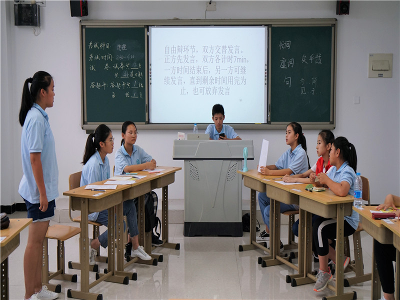 一日之計在于晨,新的一天在學生們朗朗讀書聲中拉開帷幕。晨讀過后,四個行政班均以“穿越劇對歷史的認識是利大于弊還是弊大于利”和“傳統文化加入流行元素是破壞還是傳承”為題,進行兩場辯論練習。過程中每位小辯手都展現出對辯論的無限熱愛,他們據理力爭,唇槍舌劍,精彩的辯詞更是贏來場下小觀眾們的不斷掌聲。練習結束后,實踐隊員們對學生們的表現進行表揚,并針對他們在練習中出現的問題進行指導,將自己打辯論的經驗傳授給他們。而學生們也專心致志地學習,在不斷練習中漸入佳境,對明天的辯論賽也更加自信滿滿,翹首以待。