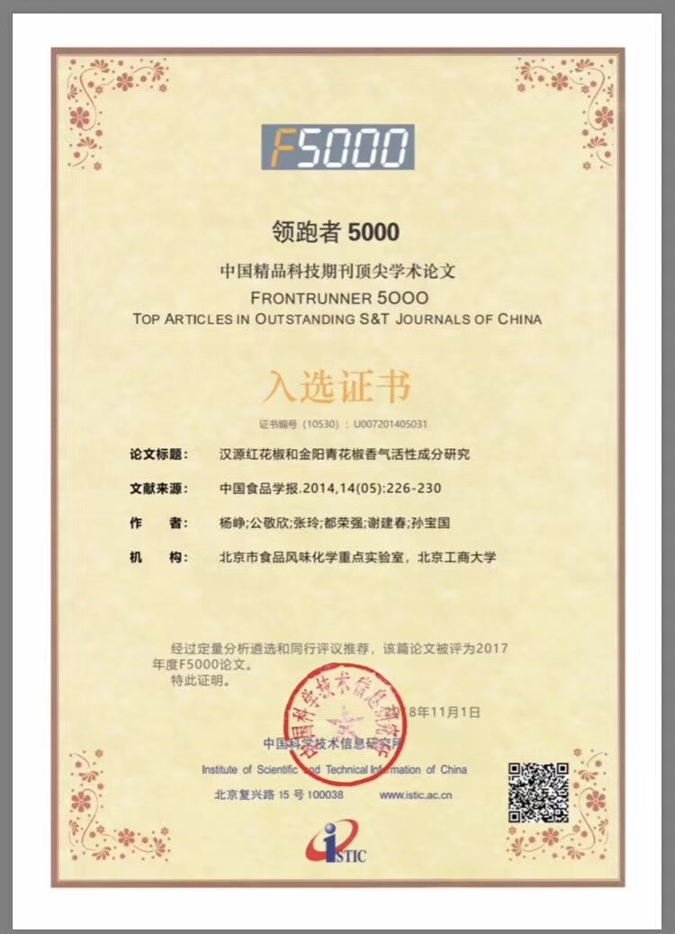 近日,在中國科學技術信息研究所發布的“領跑者5000(F5000)——中國精品科技期刊頂尖學術論文”名錄中,我校計算機信息與工程學院郭培源教授作為第一作者于2013年發表的《基于近紅外光譜技術的豬肉新鮮度等級研究》、我校食品學院謝建春教授、孫寶國院士于2014年發表的《漢源紅花椒和金陽青花椒香氣活性成分研究》論文獲得入選。這是我校再度入選F5000的論文。