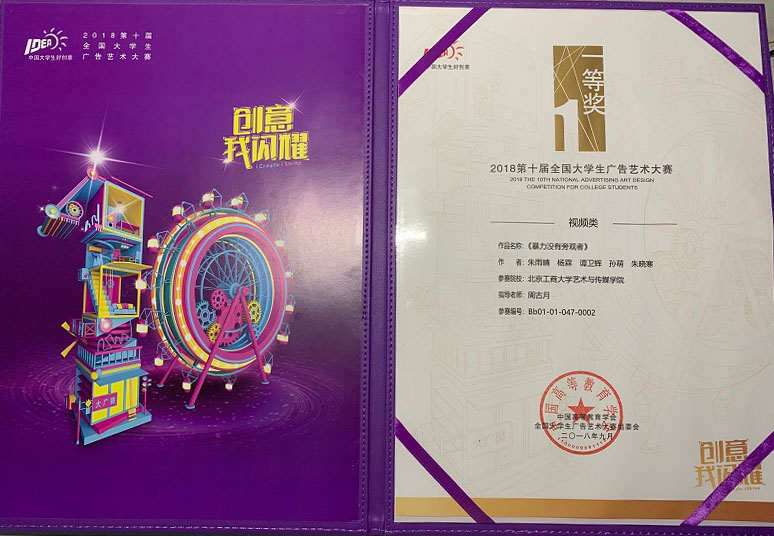 11月24日,由中國高等教育學會、教育部高等學校新聞傳播學類專業教學指導委員會主辦的第十屆(2018)全國大學生廣告藝術大賽(以下簡稱大廣賽)頒獎典禮在全國政協禮堂舉行。我校藝術與傳媒學院廣告系16級學生朱雨晴、楊霖、譚衛輝、孫萌、朱曉寒團隊憑借作品《暴力沒有旁觀者》榮獲此次比賽視頻組公益類全國一等獎,15級學生李智佳、李婷、馬柯、董悅然、郭怡萌團隊憑借作品《聲聲不息》取得了策劃案公益類全國三等獎的好成績。