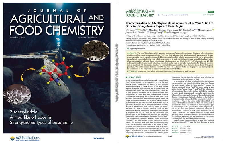 近日,我校食品學(xué)院“白酒化學(xué)”研究團(tuán)隊(duì)以董蔚為第一作者,孫嘯濤為通訊作者在美國(guó)化學(xué)學(xué)會(huì)期刊Journal of Agricultural and Food Chemistry最新一期(2018,Volume 66,Issue 48)發(fā)表了題為 “Characterization of 3-Methylindole as a Source of a ‘Mud’-like Off-Odor in Strong-Aroma Types of Base Baijiu” 的封面論文。